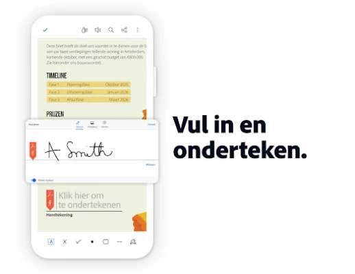 Stroomlijn uw documentworkflow met Adobe Acrobat Reader, de complete oplossing voor al uw PDF-behoeften. Vergeet het gedoe met printen, handmatig invullen en scannen van papieren. Dankzij de recente integratie van de krachtige functies van Adobe's Fill & Sign, kunt u nu moeiteloos formulieren invullen, digitaal ondertekenen en veilig versturen, direct vanaf uw mobiele apparaat. Zelfs een foto van een fysiek document transformeert u eenvoudig in een bewerkbaar en ondertekenbaar bestand, waardoor papierwerk verleden tijd is.