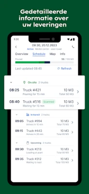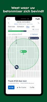 Nooit meer stress over de aankomst van cruciale materialen. Met **OnSite** houdt u de polsslag van uw logistiek in de gaten. Volg de exacte locatie en controleer de actuele status van elke betonmixer die onderweg is naar uw werf, rechtstreeks vanaf uw mobiele apparaat. Deze real-time transparantie garandeert dat u altijd op de hoogte bent en uw teams ter plaatse efficiënt kunt aansturen, wat kostbare wachttijden en miscommunicatie elimineert.